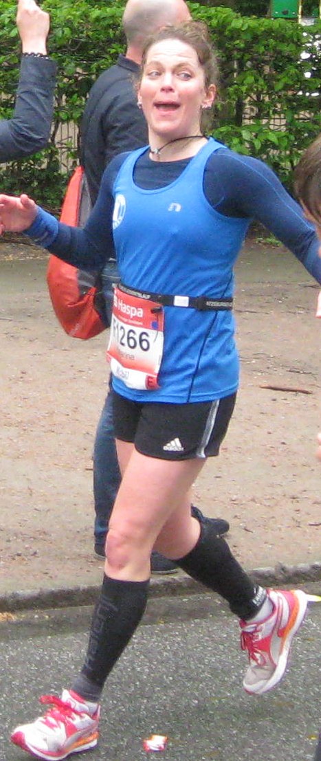 Jetzt, nach meinem Marathondebüt, kann ich sagen: Glück gehabt! Dem Fuß geht es nach wie vor gut. Die Zielzeit von knapp unter 4 Stunden gehen völlig in Ordnung, ich habe die fehlende Langstreckenerfahrung gemerkt. Noch bei Kilometer 35 wäre ich am liebsten in die Bahn gestiegen, so sehr haben die Beinmuskeln geschmerzt. Tatsächlich war Olli bei Km 38 mein nächstes Zwischenziel. Mit dem lustigsten Lauffoto was es von mir gibt und dem Satz: „Locker weiterlaufen!“ (Haha 😉) ging es zumindest für ein Stück leichter.