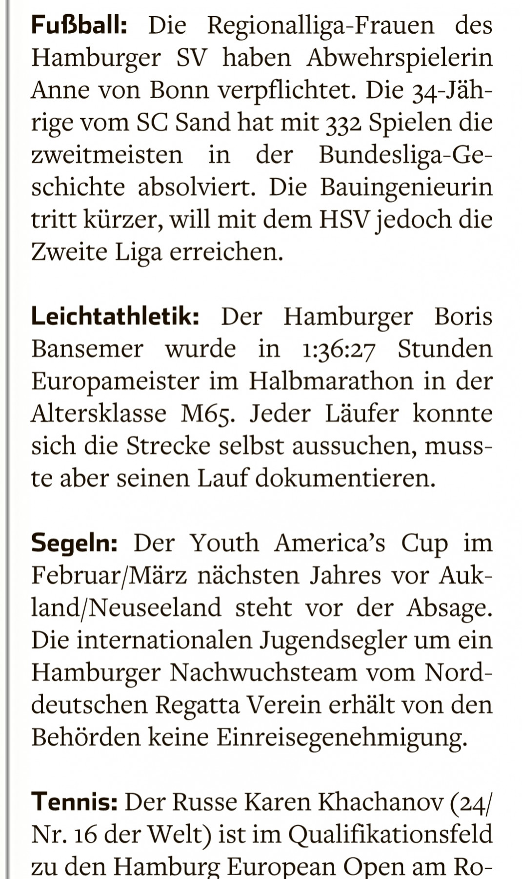 Ich verschlief die ersten Monate und wachte im August auf. "Wir brauchen dich für die deutsche Mannschaft," rief Robert Rohregger (gewann später die M55 in Einzel und Mannschaft!) aus Steinhagen, Kreis Gütersloh so laut, daß ich aufwachte. Halbmarathon. 21.095 harte Meter. Alleine. Eine fast endlose Quälerei lag vor mir. Robert absagen? Unmöglich. 2014 hatte er sich im über 40° C heißen Izmir, Türkei mit Magenkrämpfen brutal durchgekämpft und uns zum Europameister gemacht. Von 12 gestarteten Türken waren 11 damals ausgestiegen. Robert nicht. Also ran da. Ich wählte die Strecke von Marienthal zum Öjendorfer Park, drehte zwei Runden und dann wieder zurück. Unter 1:40 Stunden hatte ich vollmundig verkündet, lief 4:40 an und das lief erstaunlich gut. Am Ende war sogar noch etwas Feuer da. Bei 1:36:27 Stunden war die Quälerei zu Ende. So langsam wie noch nie, aber doch so gut es eben ging. Im Alter werden halt die Strecken kürzer und die Zeiten länger. Sei's drum. Das Beste kommt bekanntlich zum Schluß. Ich war mit 22 Sekunden Vorsprung der Schnellste vor einem Rumänen, der im letzten Jahr noch beachtliche 1:28 Stunden in der M65 lief. "Gold-Boris" schrieb die Bild-Zeitung tags darauf und erwähnte sogar den Hamburger Sportclub als Verein, was im Abendblatt keine leider Beachtung fand.