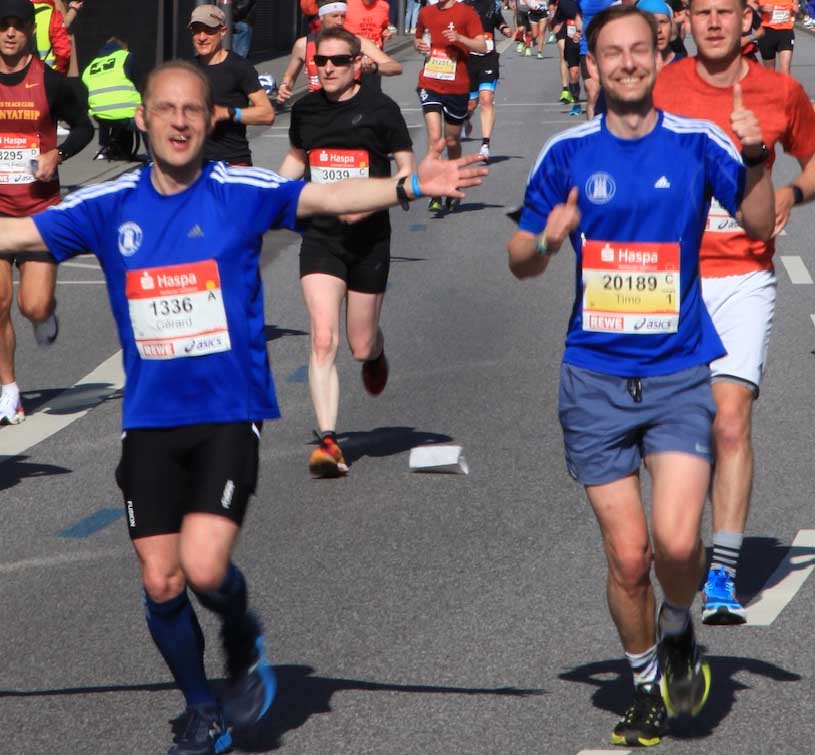 Ab circa Km 10 holte mich unser Staffel-Startäufer Timo ein, mit dem ich gemeinsam am begeisternden Hotspot Landungsbrücken und an unserem Starfotografen Piet – in Begleitung des leider verletzten Werner – voll genüßlich vorbeilief. An uns vorbei lief in diesem Abschnitt kein Geringerer als der 5000-Meter-Olympiasieger von 1992, Dieter Baumann, als Staffelläufer unterwegs und uns grüßend. Der Staffelwechsel von Timo zu Thomas bei Km 16 funktionierte so gut, dass ich gleich den nächsten HSC-Partner für die folgenden 3-4 Kilometer an meiner Seite hatte. Das war nicht geplant, aber umso schöner. Bis zur Hälfte des Marathons, die ich in 1:33:41 sogar eine Minute langsamer als geplant erreichte, konnte ich den Lauf absolut genießen, obwohl bereits einige Streckenabschnitte durch den partiellen Gegenwind beeinträchtig worden sind. Auch die durchgehend scheinende und auch wärmende Sonne machte sich langsam und im weiteren Verlauf des Rennens deutlich bemerkbar (war doch ein Fehler, auf eine Kappe verzichtet zu haben).