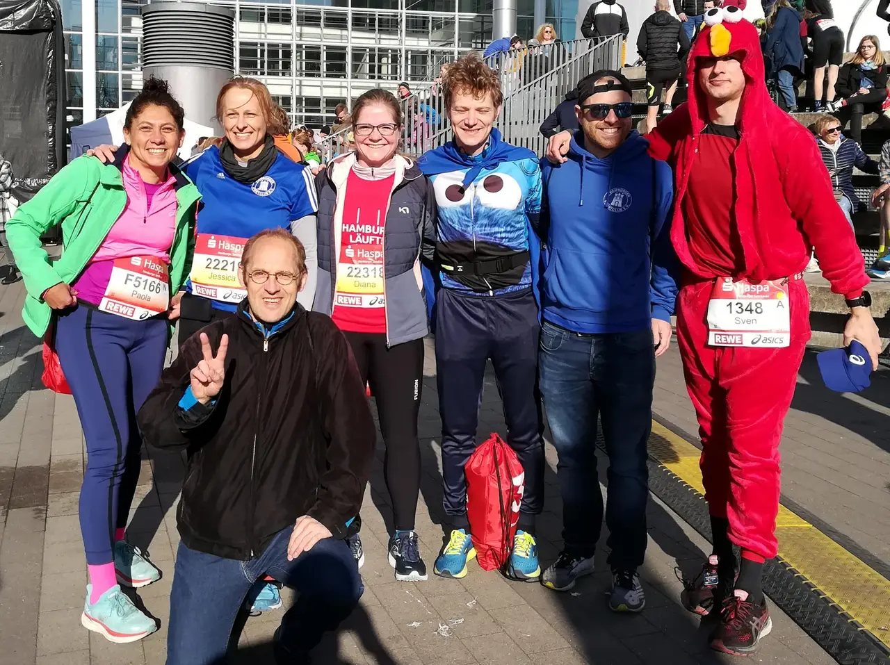Nach dem durch Corona-Maßnahmen eingeschränkten Marathon im September 2021 fand Hamburgs Vorzeige-Lauf-Event dieses Jahr wieder, sieht man von der eher leger gehaltenen Maskenpflicht im Start-Ziel-Bereich ab, unter „normalen“ Bedingungen statt. Strahlender Sonnenschein bei circa 8 Grad empfing uns vor dem Start, Hamburg zeigte sich von seiner schönsten Seite. Nach einem HSC-Gruppenfoto noch ein etwas zu kurzes Warmlaufen, bevor es fünf Minuten vor dem Startschuss um 9.30 Uhr in meinen Block ging. Da ich für die Hamburger Meisterschaft gemeldet war, durfte ich mich sogar im Block A einsortieren. Eine überaus nette Geste des Veranstalters, alle Meisterschaftsläufer nach ganz vorne zu platzieren, normalerweise starte ich in Block C.