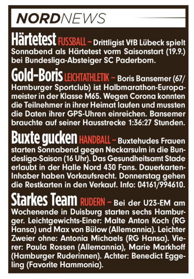 Ich verschlief die ersten Monate und wachte im August auf. "Wir brauchen dich für die deutsche Mannschaft," rief Robert Rohregger (gewann später die M55 in Einzel und Mannschaft!) aus Steinhagen, Kreis Gütersloh so laut, daß ich aufwachte. Halbmarathon. 21.095 harte Meter. Alleine. Eine fast endlose Quälerei lag vor mir. Robert absagen? Unmöglich. 2014 hatte er sich im über 40° C heißen Izmir, Türkei mit Magenkrämpfen brutal durchgekämpft und uns zum Europameister gemacht. Von 12 gestarteten Türken waren 11 damals ausgestiegen. Robert nicht. Also ran da. Ich wählte die Strecke von Marienthal zum Öjendorfer Park, drehte zwei Runden und dann wieder zurück. Unter 1:40 Stunden hatte ich vollmundig verkündet, lief 4:40 an und das lief erstaunlich gut. Am Ende war sogar noch etwas Feuer da. Bei 1:36:27 Stunden war die Quälerei zu Ende. So langsam wie noch nie, aber doch so gut es eben ging. Im Alter werden halt die Strecken kürzer und die Zeiten länger. Sei's drum. Das Beste kommt bekanntlich zum Schluß. Ich war mit 22 Sekunden Vorsprung der Schnellste vor einem Rumänen, der im letzten Jahr noch beachtliche 1:28 Stunden in der M65 lief. "Gold-Boris" schrieb die Bild-Zeitung tags darauf und erwähnte sogar den Hamburger Sportclub als Verein, was im Abendblatt keine leider Beachtung fand.