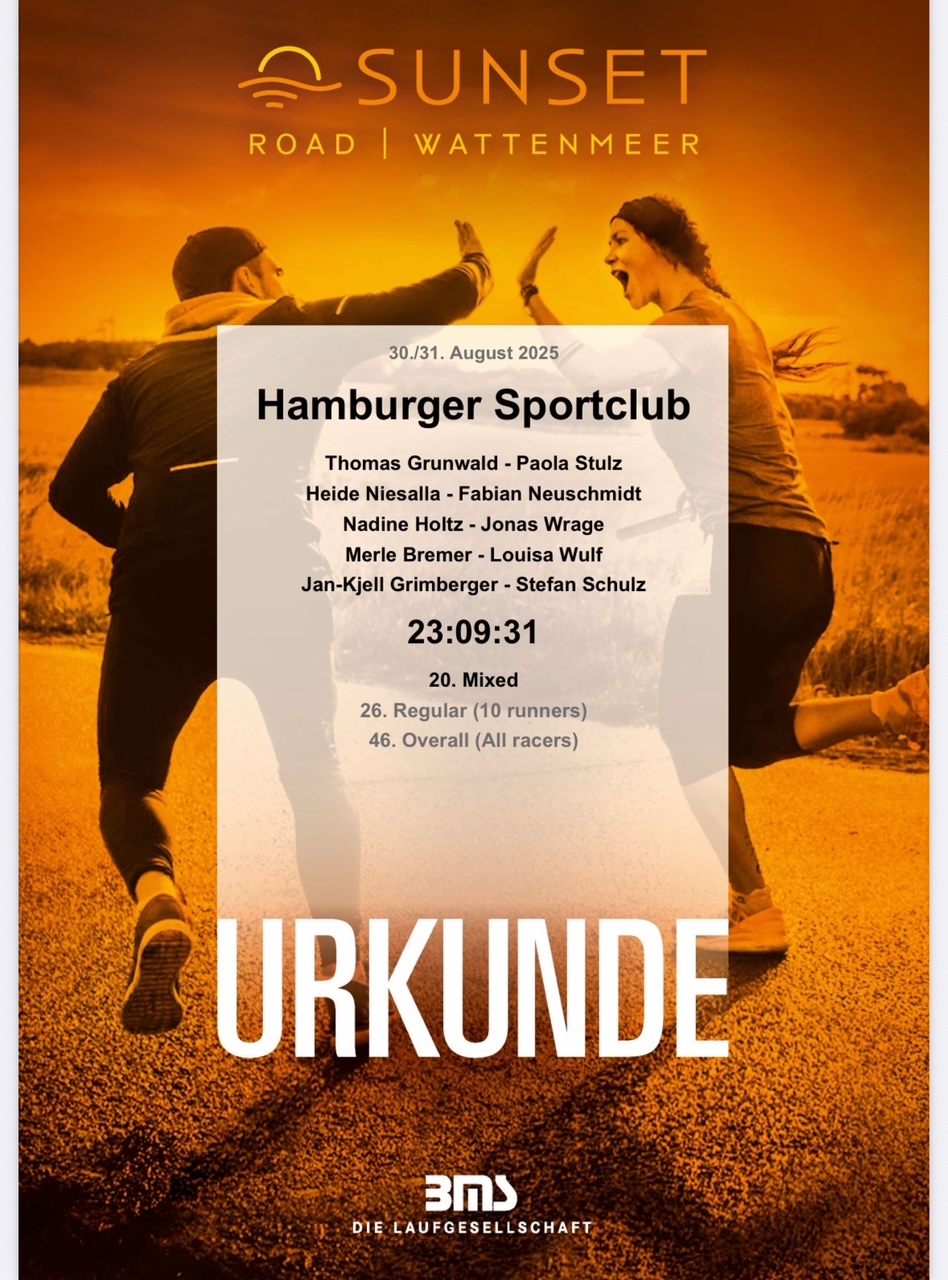 Am 30. August 2025 startete unser Team des Hamburger Sportclubs beim diesjährigen Sunset Run. Die Strecke führte uns von der malerischen Kulisse des Hamburger Fischmarkts bis an den Strand von St. Peter-Ording – eine sportliche Herausforderung von insgesamt rund 250 Kilometern, die sich in insgesamt 30 Etappen aufteilten. Dieser Herausforderung haben wir uns im 10er-Mixed-Team von 5 Frauen und 5 Männern gestellt. Die "verrückten" waren Thomas, Jonas, Fabian, Kjell, Nadine, Heide, Stefan, Louisa, Merle und Paola.